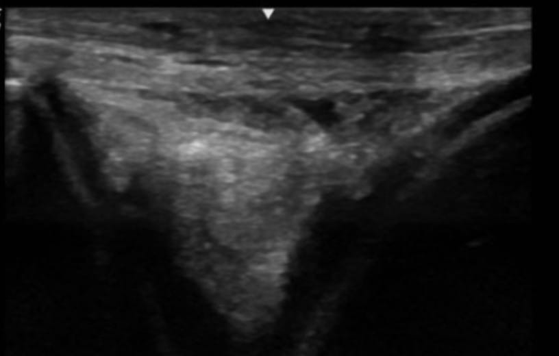 Ultrasound of the right stifle showed moderate medial femorotibial joint effusion with small hyperechoic particles, consistent with thin cartilage debris. There was a 1.5 cm x 0.5 cm defect in the abaxial portion of the medial trochlear ridge.