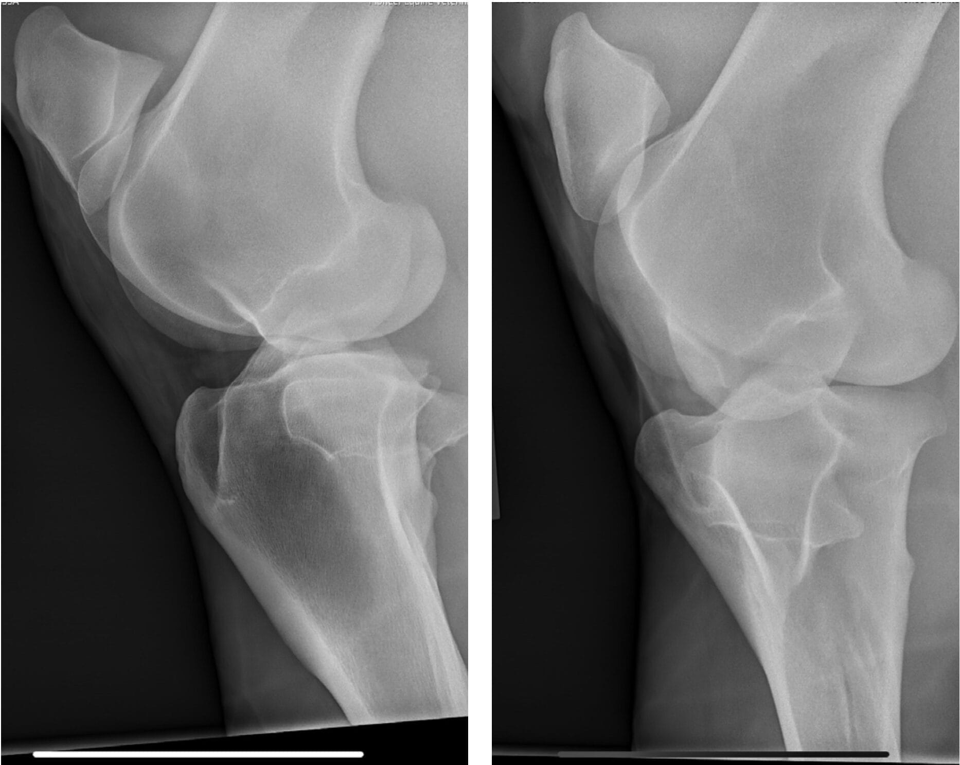 In April 2023, Bella developed a right hind lameness that was characterised by a toe drag, decreased push and mild abduction of the limb. The lameness was worse with the leg on the outside of the circle. She was negative to lower limb flexion and 1+ out of 5 positive to upper limb flexion. Lameness resolved with an intra-articular medial femorotibial block. Radiographs of the right stifle were unremarkable.